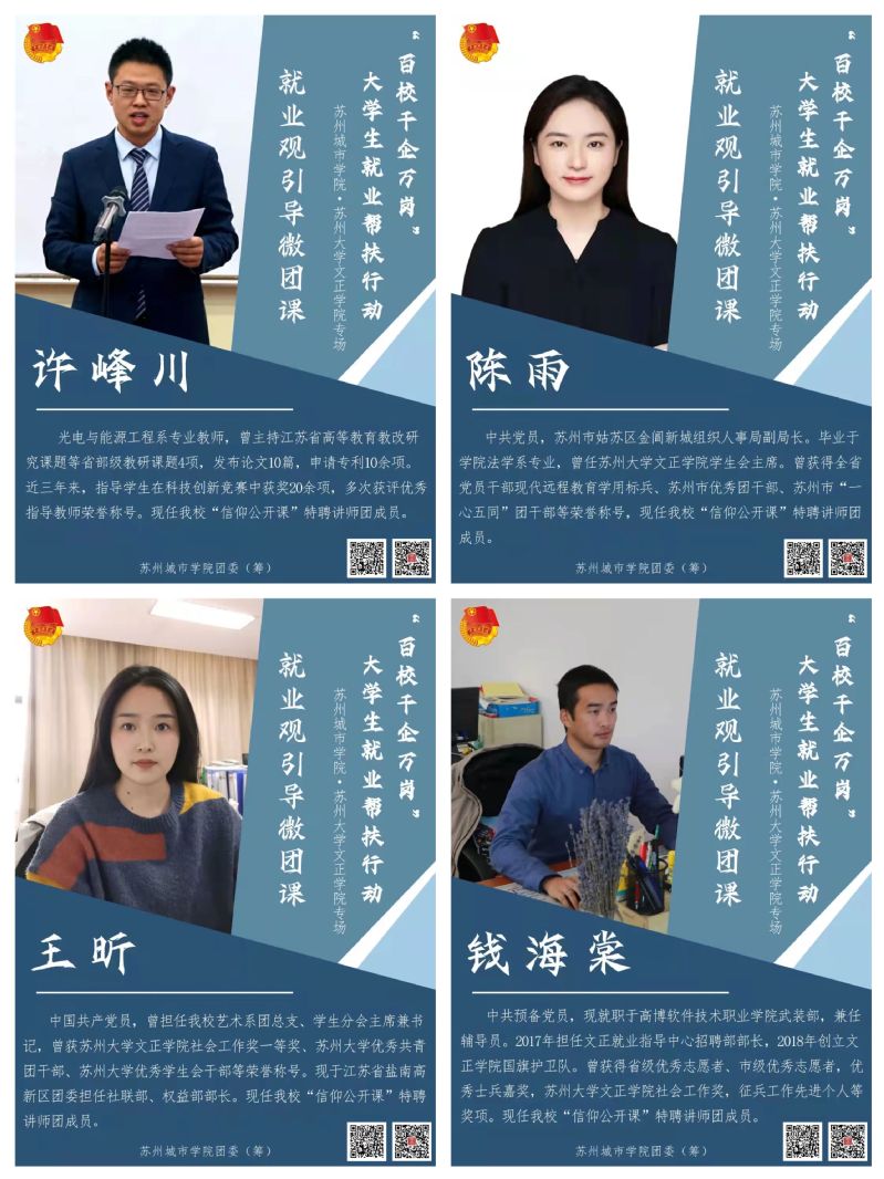 整合校地企优质资源,先后与省招就中心、共青团苏州市委员会等联合举办“江苏省‘服务地方促发展 科技兴邦建新功’网络招聘会”、“名企优才,职’为你开”秋季大型校园招聘会和“百校千企万岗”大学生就业帮扶行动等活动,为毕业生搭建就业供需平台,力促毕业生更充分更高质量就业。