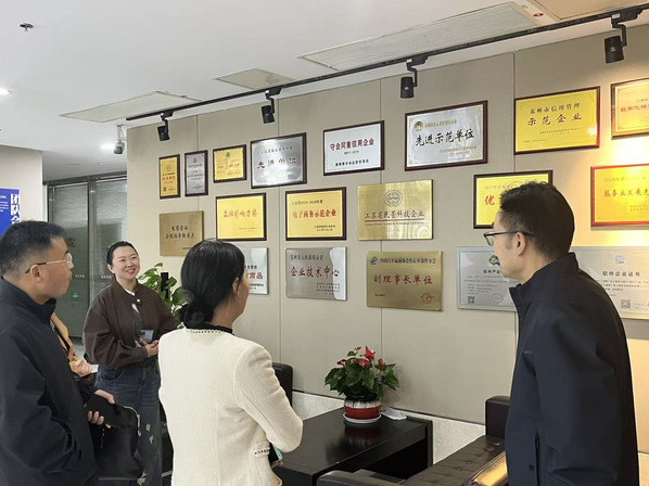 调研首站,团队到访苏州金枫控股集团电商产业园,受到集团副总经理张洁丽、增值业务部总监董婷婷等人的热情接待。在金枫产业园,调研团队重点考察了其构建的从创业孵化、企业加速到电商跨境出海的“一条龙”服务体系。团队实地走访了创业孵化中心,详细了解其如何为初创企业提供资源支持与成长空间。